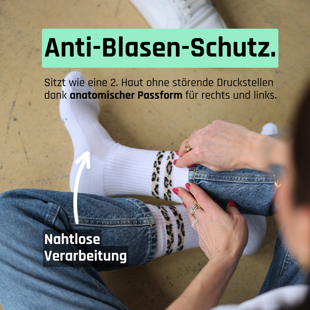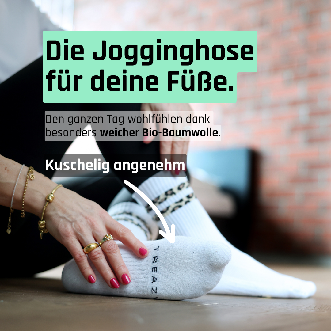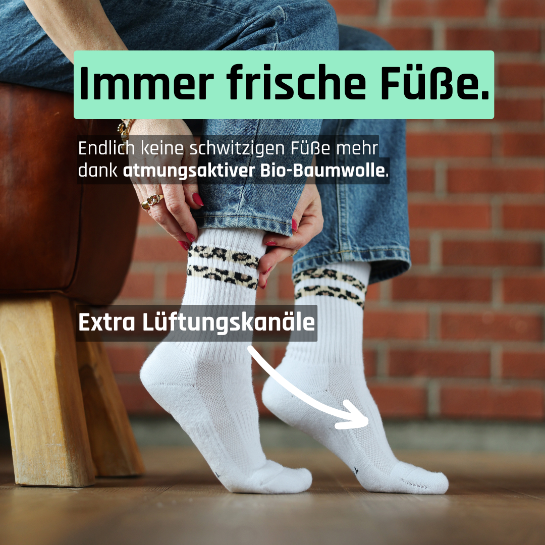 Tennis Socken im "Leo-Look" - mit der Instagram-Community von Stini (@mamaglueckundkuchenzauber) entwickelt! Wenn du sie anziehst, willst du keine anderen mehr. Wie eine zweite Haut passen sie sich deinen Füßen an. Die super weiche Bio-Baumwolle lässt dich wie auf Wolken laufen. Schweißfüße, Blasen oder Löcher? Kommt uns nicht in die Socke! Nachhaltig und fair produziert in Portugal. Eine Super-Socke? Dei Fans von Stini bestätigen das!