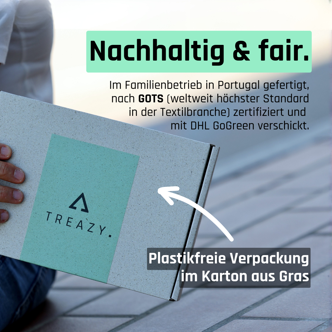 Wir sind von der höchsten Qualität deiner Lieblingssocken so überzeugt, dass wir zusätzlich eine Keine-Löcher-Garantie draufpacken. Wenn unsere Socken innerhalb von 1 Jahr nach dem Kauf ein Loch bekommen, senden wir dir kostenlos ein neues Paar zu. Schicke uns in dem Fall einfach eine E-Mail an team@treazy.de.