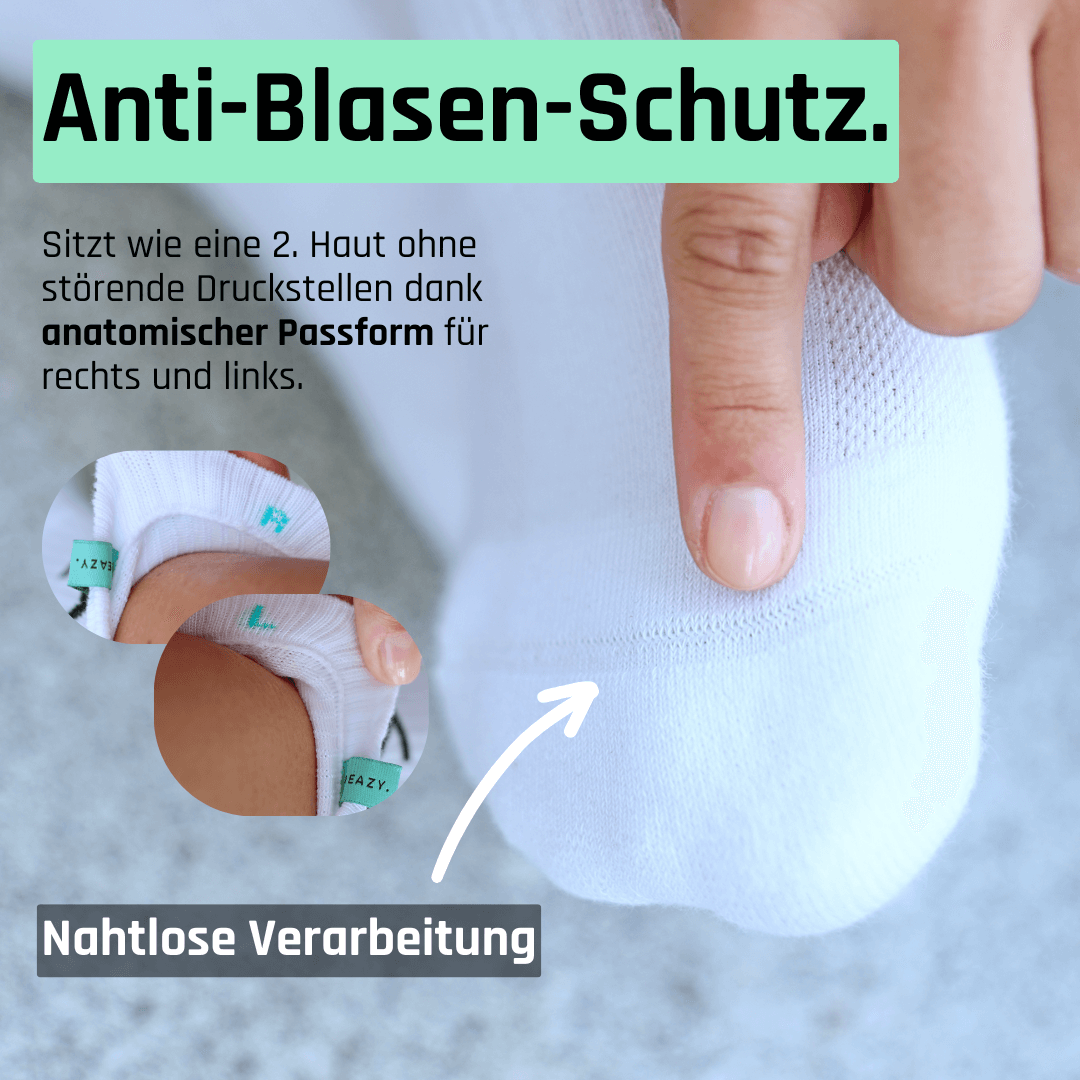 Die Socken sitzen wie eine zweite Haut. Dadurch rutschst du nicht und Blasen haben keine Chance. Die gepolsterte Sohle und die nahtlose Verarbeitung verhindern außerdem unangenehme Druckstellen.