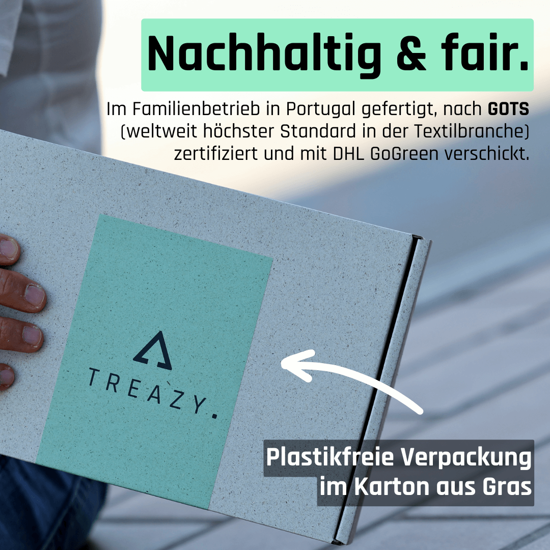 Wir sind von der höchsten Qualität deiner Lieblingssocken so überzeugt, dass wir zusätzlich eine Keine-Löcher-Garantie draufpacken. Wenn unsere Socken innerhalb von 1 Jahr nach dem Kauf ein Loch bekommen, senden wir dir kostenlos ein neues Paar zu. Schicke uns in dem Fall einfach eine E-Mail an team@treazy.de.
